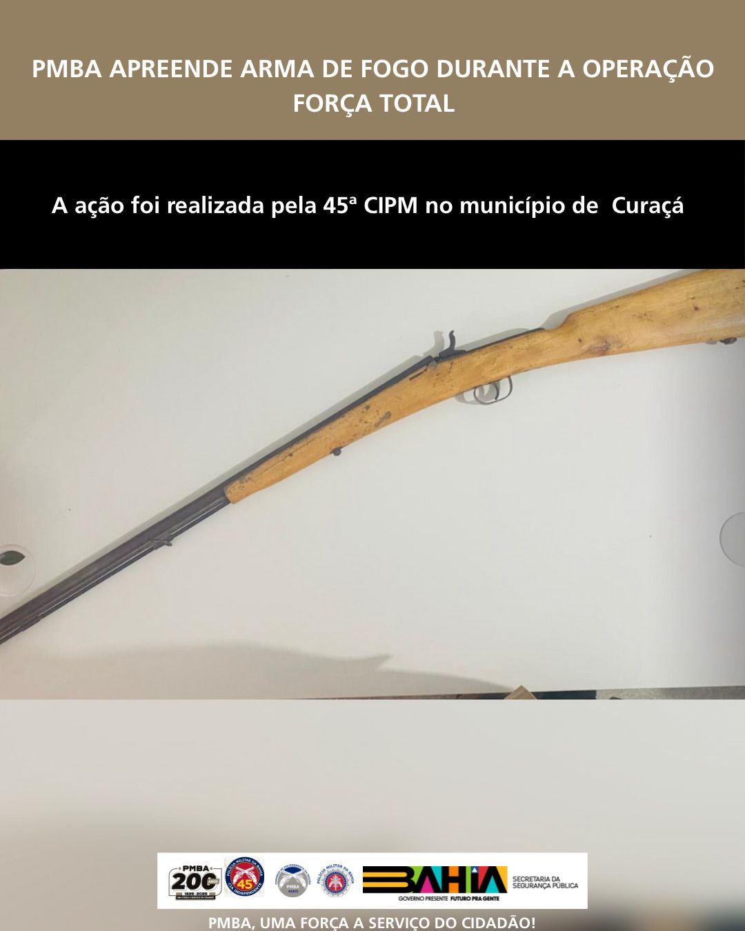 A Polícia Militar da Bahia (PMBA), por intermédio da 45ª Companhia Independente de Polícia Militar (CIPM)/Curaçá, realizou, nesta quinta-feira (26), a apreensão de uma arma de fogo durante a Operação Força Total, no município de Curaçá.