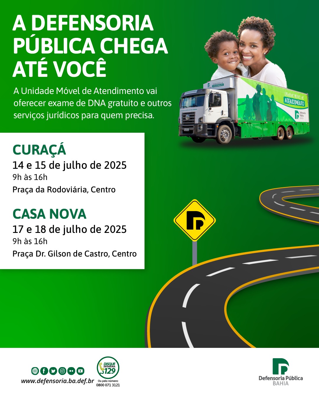 A Unidade Móvel da Defensoria Pública do Estado da Bahia (DPE/BA) voltará a percorrer o interior baiano, na próxima semana, e estacionará no território de identidade Sertão do São Francisco. Os atendimentos jurídicos gratuitos serão ofertados à população de Curaçá nos dias 14 e 15 de julho, das 9h às 16h, na praça da Rodoviária – Centro. Já nos dias 17 e 18 de julho, a Defensoria estará em Casa Nova, na praça Dr. Gilson de Castro – Centro, das 9h às 16h.