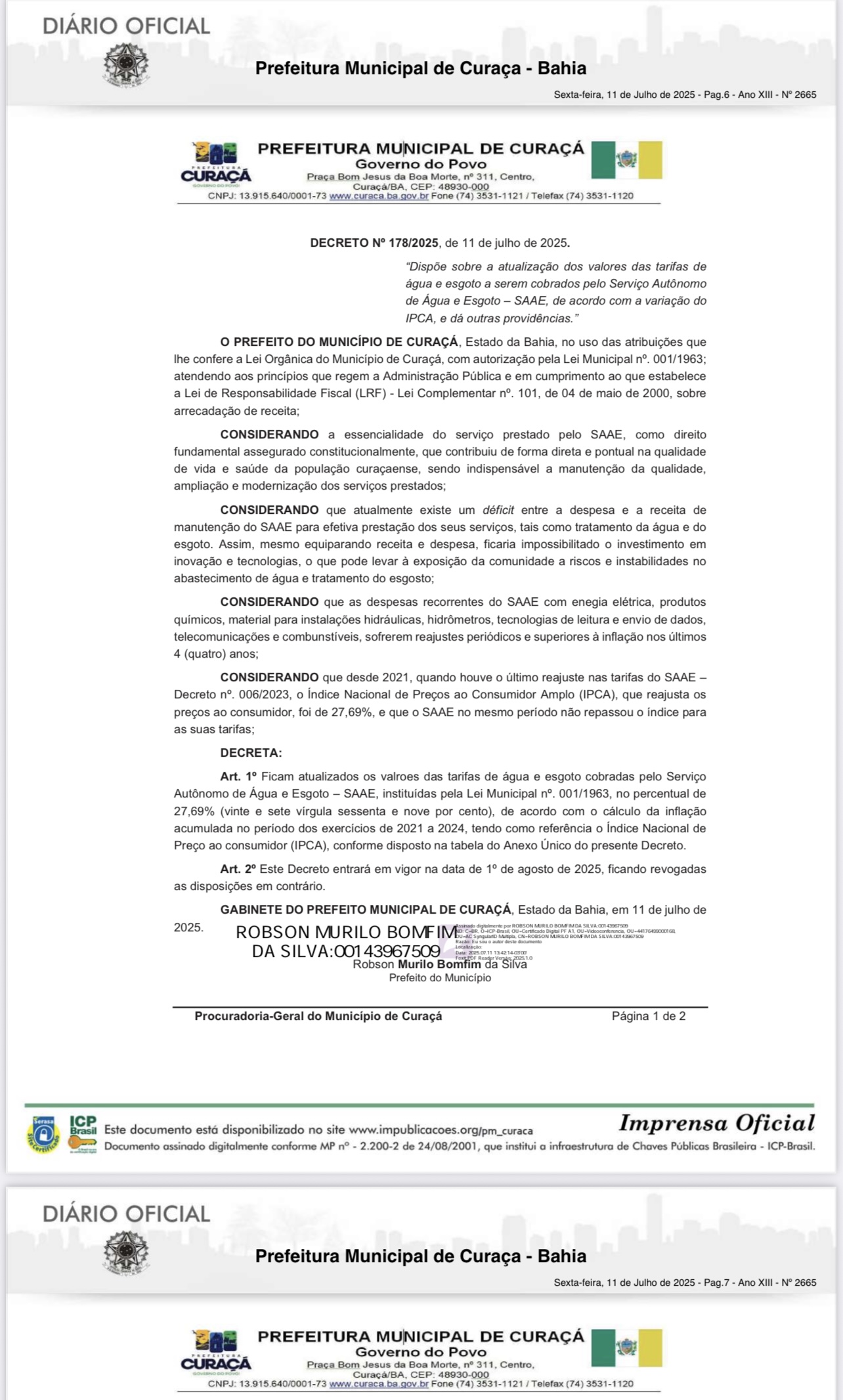 A partir de 1º de agosto de 2025, os consumidores de água e esgoto em Curaçá vão pagar mais caro pelo serviço. A Prefeitura Municipal publicou no Diário Oficial, no dia 11 de julho, o Decreto Nº 178/2025, que atualiza as tarifas do Serviço Autônomo de Água e Esgoto (SAAE), com um reajuste de 27,69%. O percentual corresponde à inflação acumulada medida pelo IPCA entre os anos de 2021 e 2024.