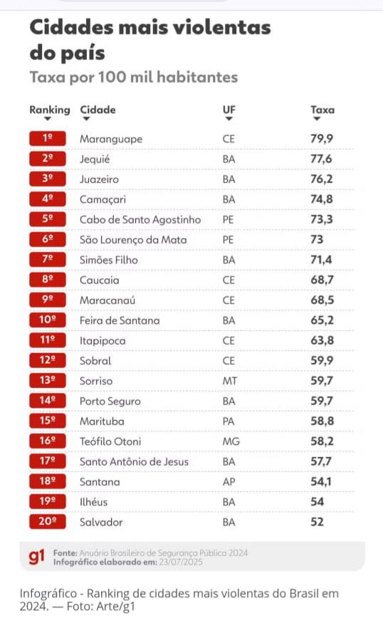 A cidade de Jequié, no sudoeste da Bahia, é a segunda mais violenta do Brasil e ficou atrás apenas de Maranguape, no Ceará. Feira de Santana, a segunda maior cidade do estado, também integra o ranking acompanhada de Juazeiro, Simões Filho e Camaçari.