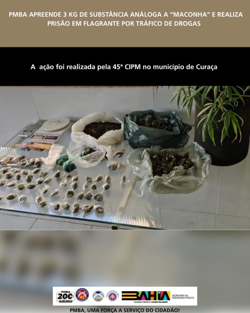 A Polícia Militar da Bahia (PMBA), por intermédio da 45ª Companhia Independente de Polícia Militar (CIPM)/Curaçá, realizou, na terça-feira (22), no município de Curaçá, uma prisão em flagrante por tráfico de drogas.