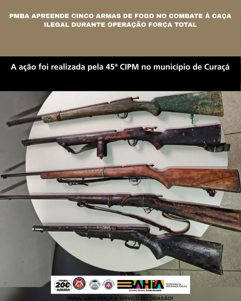 Na manhã desta quinta-feira (21), a Polícia Militar da Bahia (PMBA), por meio da 45ª Companhia Independente de Polícia Militar (CIPM), apreendeu cinco armas de fogo durante a Operação Força Total, realizada no distrito de Barro Vermelho, mais precisamente na Fazenda São Gonçalo, zona rural do município de Curaçá.