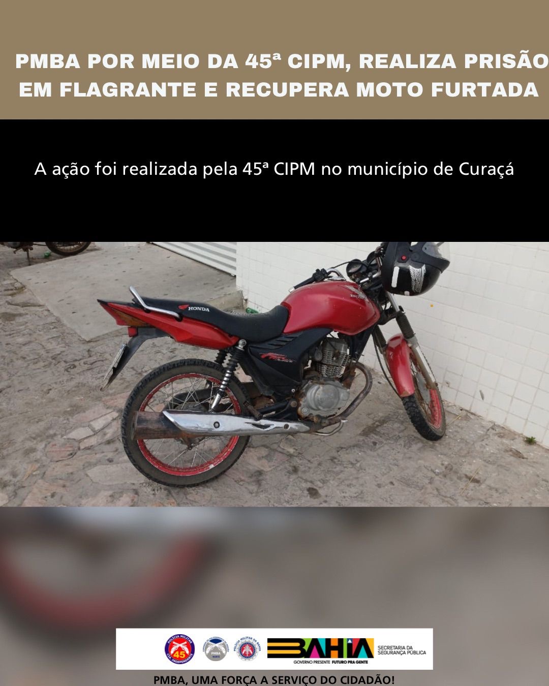 Na madrugada deste domingo (01), por volta das 4h, a Polícia Militar da Bahia (PMBA), por meio da 45ª Companhia Independente de Polícia Militar (CIPM), foi informada sobre o furto de uma motocicleta ocorrido durante a Festa da Agricultura, no distrito de Riacho Seco, município de Curaçá.