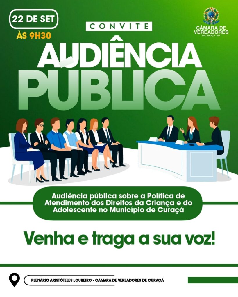 A Câmara Municipal de Curaçá realizará, na próxima segunda-feira (22), às 9h30, no Plenário Aristóteles Loureiro, uma audiência pública para tratar da Política de Atendimento dos Direitos da Criança e do Adolescente no município.