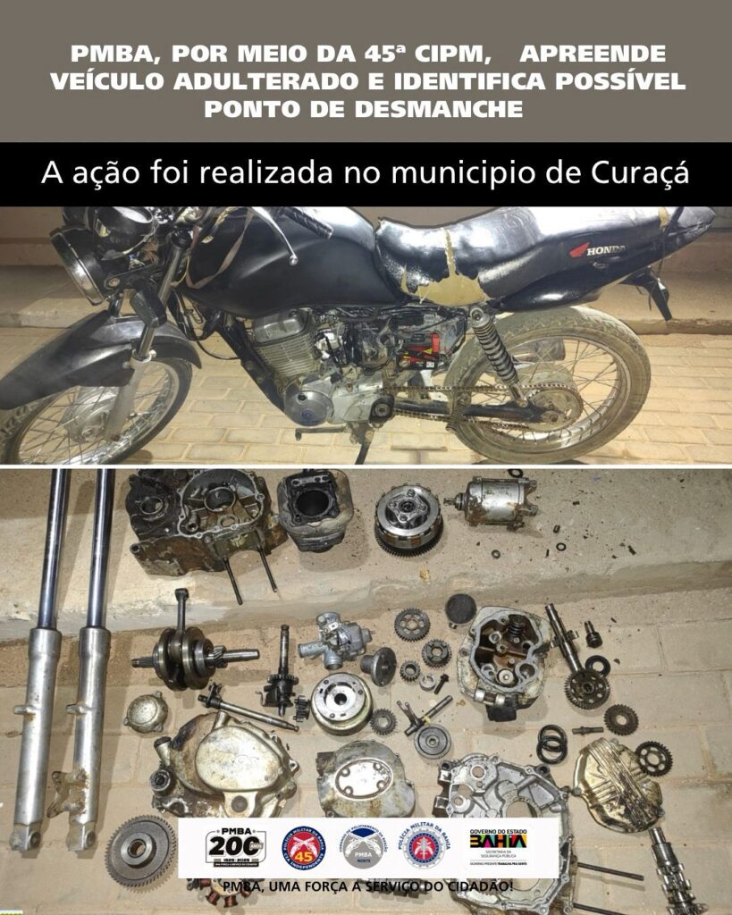 Na noite desta segunda-feira (20), por volta das 20h, a Polícia Militar da Bahia (PMBA), por meio da 45ª Companhia Independente de Polícia Militar (CIPM), apreendeu uma motocicleta com sinais de adulteração e localizou um possível ponto de desmanche de veículos no município de Curaçá.