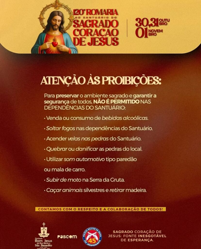 Atendendo a um decreto da CNBB, fica proibido o uso e a comercialização de bebidas alcoólicas dentro dos limites do santuário. Tal medida é essencial para preservar o ambiente de oração e evitar qualquer incidente que comprometa a dignidade e a segurança do evento. Além desta medida, não é permitido soltar fogos no entorno da gruta, subir de motocicleta as escadarias, acender velas nas pedras do Santuário, quebrar ou danificar as pedras do local, utilizar som automotivo, caçar animais silvestres e retirar madeira.