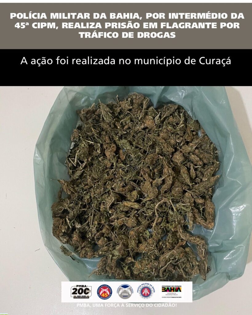 Durante a intensificação do policiamento neste sábado (01), a Polícia Militar da Bahia, por intermédio da 45ª Companhia Independente de Polícia Militar (CIPM), realizou a prisão em flagrante de um homem suspeito de tráfico de drogas no Bairro Populares, no município de Curaçá.