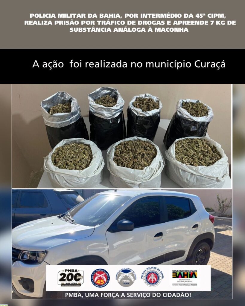 A Polícia Militar da Bahia, por meio da 45ª Companhia Independente de Polícia Militar (CIPM), realizou na tarde desta quinta-feira uma operação que resultou na prisão de um homem por tráfico de drogas e na apreensão de cerca de 7 quilos de substância análoga à maconha, na BA-210, no trecho que corta o município de Curaçá.