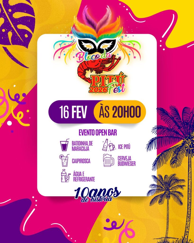 Prepare-se para uma noite inesquecível de alegria, cores e muita animação! No dia 16 de fevereiro, a partir das 20h, o tradicional Bloco da Pitú Fest comemorará 10 anos de história em grande estilo, reunindo foliões para celebrar a essência do Carnaval com muita energia e diversão.