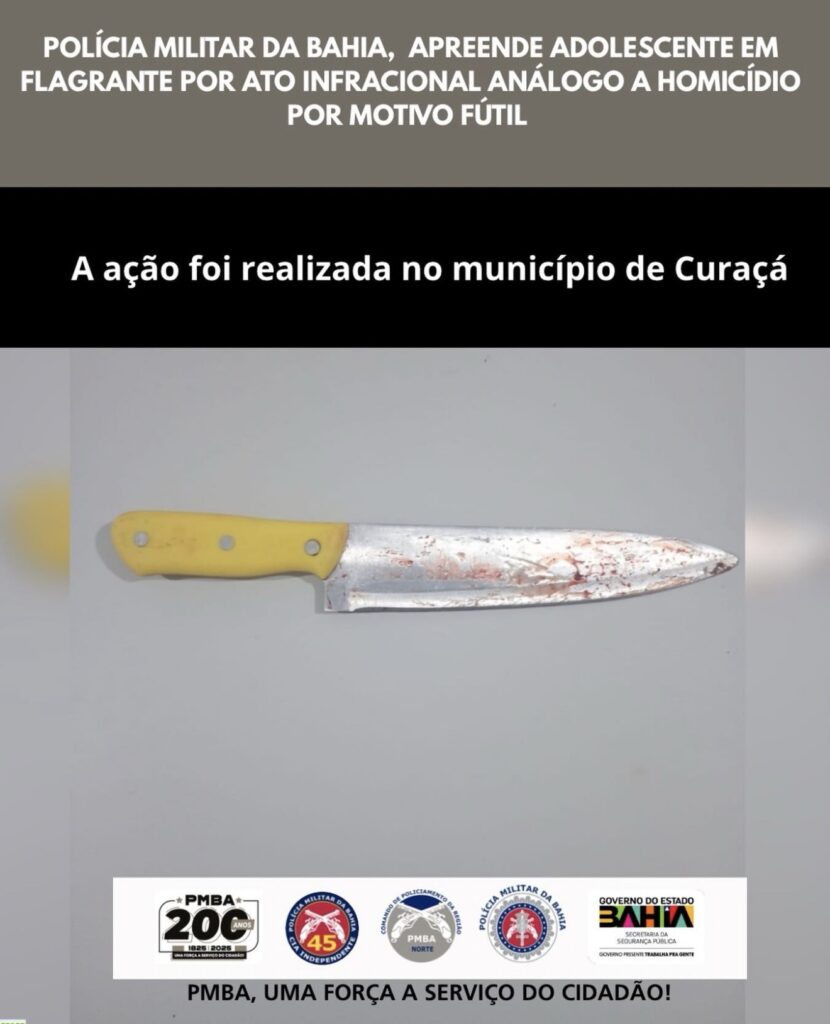 Um adolescente de 16 anos foi apreendido em flagrante nesta quinta-feira (22) por ato infracional análogo ao crime de homicídio, no município de Curaçá. A ocorrência foi registrada pela Polícia Militar da Bahia, por meio da 45ª Companhia Independente de Polícia Militar (CIPM). De acordo com a PM, durante rondas ostensivas pelo centro da cidade, a guarnição foi informada sobre um homem ferido na Rua Dr. Pompílio P. Coelho. Ao chegar ao local, os policiais encontraram um homem do sexo masculino caído ao solo, sem camisa e vestindo calça de cor cinza.