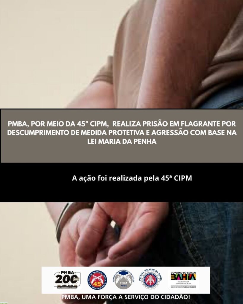 A Polícia Militar da Bahia (PMBA), por intermédio da 45ª Companhia Independente de Polícia Militar (CIPM) / Curaçá, realizou, nesta quinta-feira (30), a prisão em flagrante de um homem pelo descumprimento de medida protetiva e por agressão, com base na Lei Maria da Penha, no município de Curaçá.