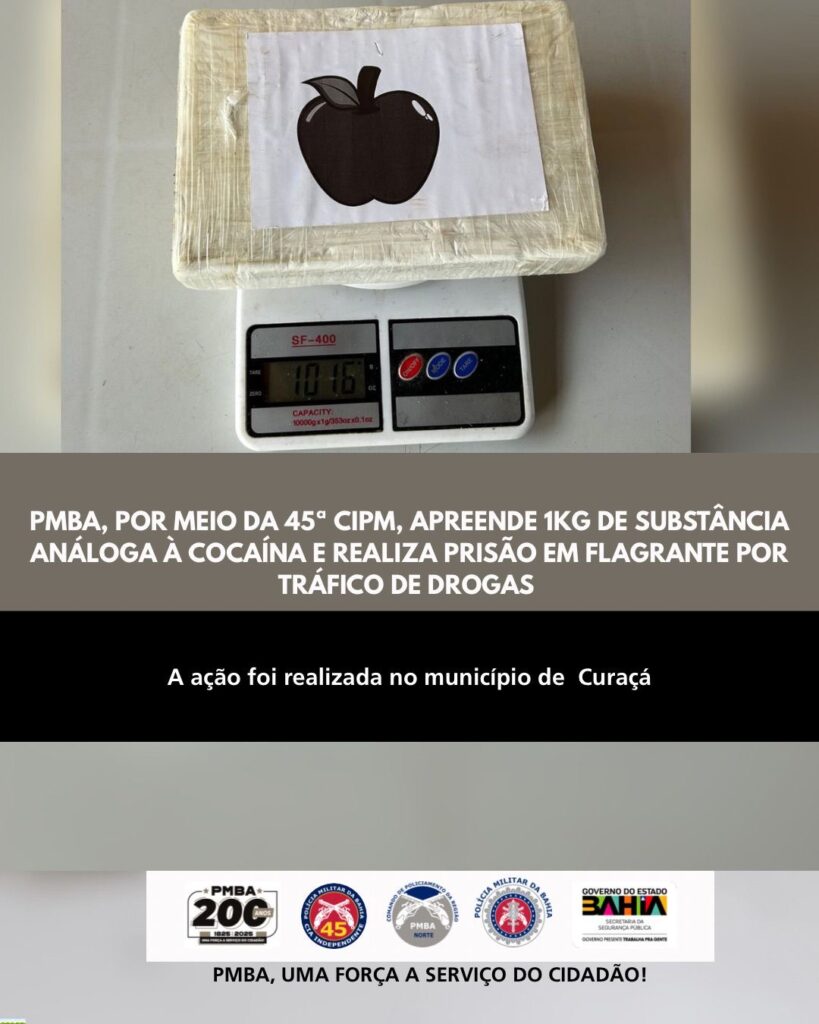 A Polícia Militar da Bahia (PMBA), por intermédio da 45ª Companhia Independente de Polícia Militar (CIPM/Curaçá), realizou, nesta sexta-feira (20), a apreensão de substância análoga à cocaína e a prisão em flagrante de um homem por tráfico de drogas no município de Curaçá.