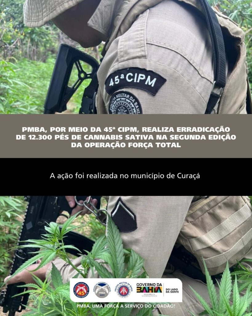 A Polícia Militar da Bahia (PMBA), por intermédio da 45ª Companhia Independente de Polícia Militar (45ª CIPM/Curaçá), realizou, nesta quinta-feira (26), durante a segunda edição da Operação Força Total, a erradicação de um plantio de cannabis sativa (maconha) no município de Curaçá.