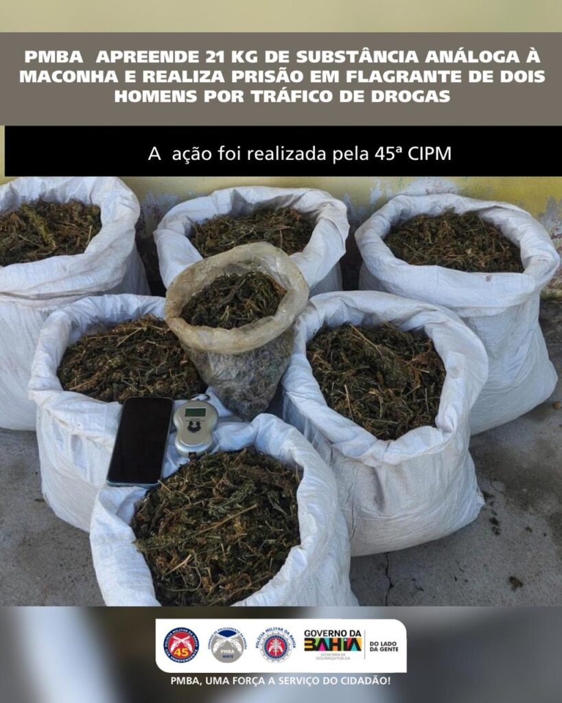 A Polícia Militar da Bahia (PMBA), por intermédio da 45ª Companhia Independente de Polícia Militar (45ª CIPM/Curaçá), realizou, nesta quinta-feira (09), a apreensão de 21 kg de maconha e a prisão em flagrante de dois homens por tráfico de drogas no município de Curaçá.