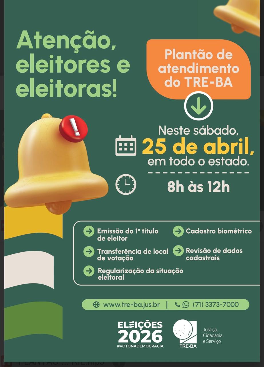 Com a proximidade do fechamento do Cadastro Eleitoral para as Eleições 2026, no dia 6 de maio, os cartórios eleitorais da capital e do interior, bem como a Central de Atendimento ao Público (CAP) do Tribunal Regional Eleitoral da Bahia (TRE-BA), funcionarão em regime de plantão. O atendimento extraordinário ocorrerá nos dias 25/4 (sábado); 1º/5 (sexta-feira – feriado) e 2/5 (sábado), das 8h às 12h. A medida foi estabelecida pela Portaria nº 406, de 7 de abril de 2026, publicada no Diário da Justiça Eletrônico (DJE), e visa disponibilizar os serviços desta Justiça para cadastramento de novos(as) eleitores(as) e para aqueles(as) que ainda precisam regularizar pendências.