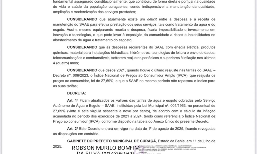 A partir de 1º de agosto de 2025, os consumidores de água e esgoto em Curaçá vão pagar mais caro pelo serviço. A Prefeitura Municipal publicou...