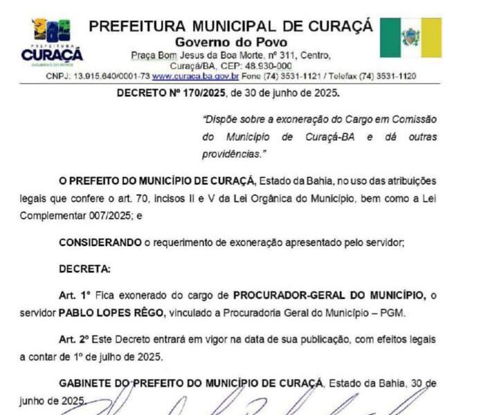 Por meio do Decreto nº 170, de 30 de junho de 2025, a Prefeitura Municipal de Curaçá oficializou a exoneração de Pablo Lopes Rêgo do cargo...