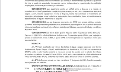 A decisão da Prefeitura de Curaçá em aumentar 27,69% a tarifa de água e esgoto do SAAE, por meio do Decreto nº 178/2025, publicado no Diário...