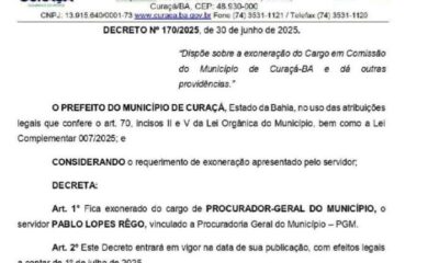 Por meio do Decreto nº 170, de 30 de junho de 2025, a Prefeitura Municipal de Curaçá oficializou a exoneração de Pablo Lopes Rêgo do cargo...